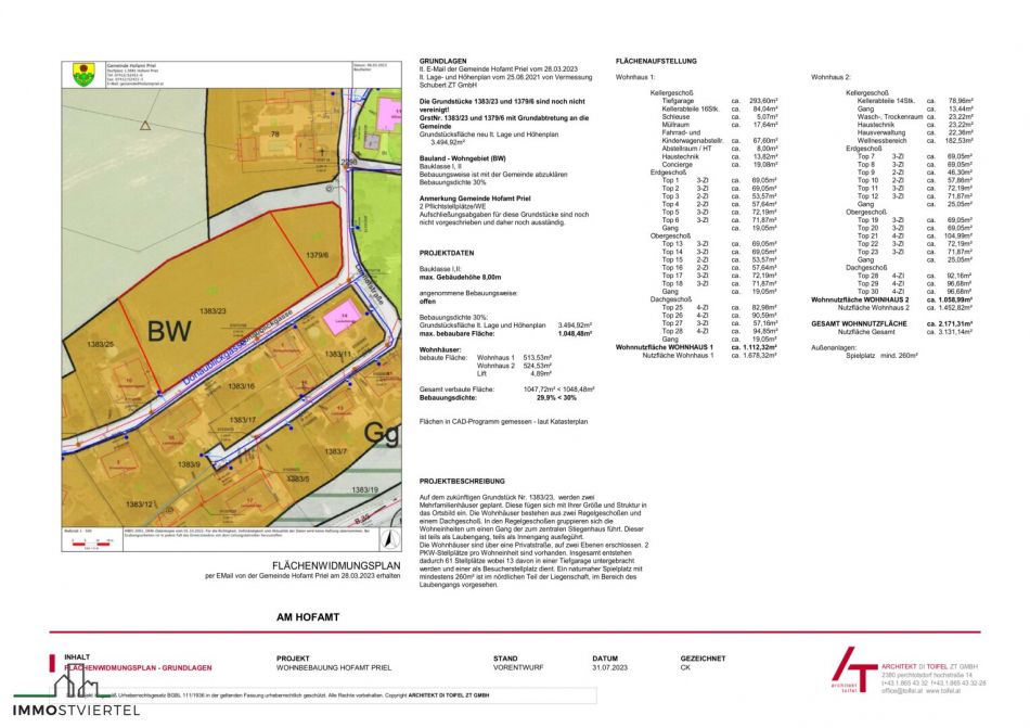 * Baurechtszins wird mit der WNFL. vom Projektentwurf berechnet 2171,31 m² mögliche ges. WNFL. x 0,96 € = € 2084,46.- pro Monat Wertgesichert nach VPI