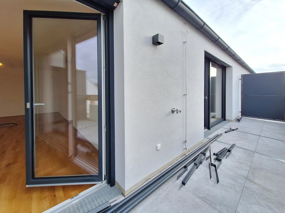 - außergewöhnlich große Terrasse begehbar aus beiden Zimmern (mit Wasseranschluss, Steckdose, Beleuchtung und Blumentröge)