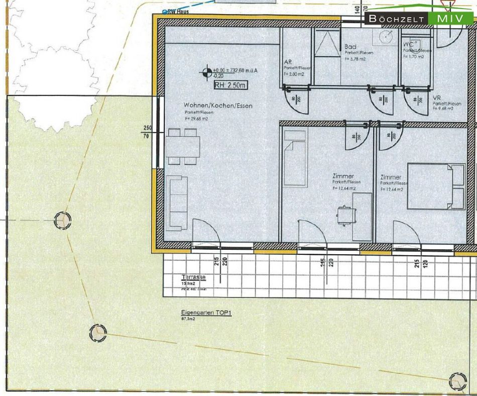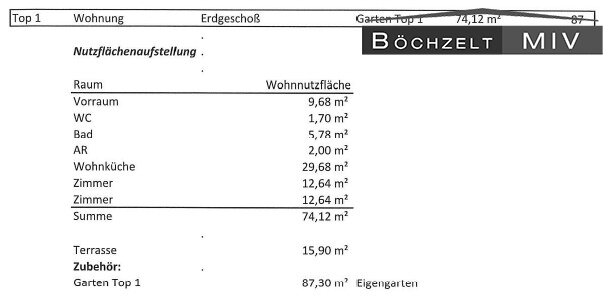 Zur Wohnung gehört eine Terrasse mit ca. 15,90 m² (Betonbelag) sowie ein Eigengarten mit rund 87,3 m² laut Plan. Diese Kombination aus Terrasse und Garten macht das Objekt besonders für Eigennutzer attraktiv, die Wert auf Freiflächen und Wohnen im Grünen legen - ideal zum Entspannen, Grillen oder als Spielfläche für Kinder.