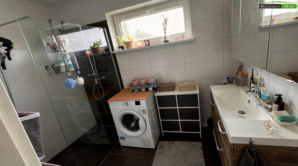 Das Bad mit ca. 5,78 m² ist mit zeitgemäßen Fliesen und Sanitärausstattung ausgeführt und verfügt über ausreichend Platz für ein modernes Familienbad.