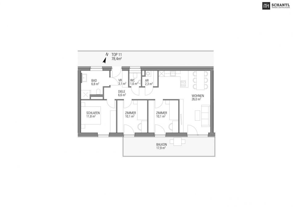 - Großer Wohn-/Essbereich mit 26 m² – Herzstück der Wohnung, hell & einladend.