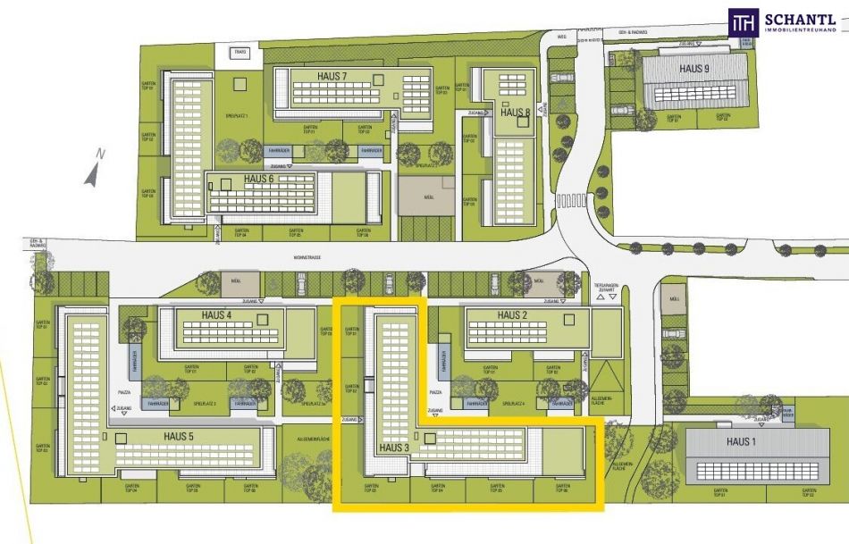 - Grüne, familienfreundliche Umgebung – Spielplätze, Freiflächen und Erholungsbereiche direkt im Areal.