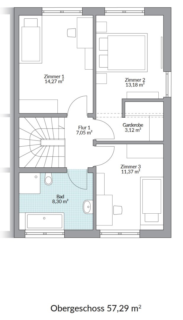 Im Obergeschoss stehen drei praktisch geschnittene Schlafzimmer zur Verfügung, eines davon mit Ankleide, sowie ein großzügiges Badezimmer. Dieses überzeugt mit zeitgemäßer Ausstattung, moderner Dusche und Badewanne – ideal für entspannte Momente. Der großzügige Waschtisch bietet ausreichend Platz für die ganze Familie.