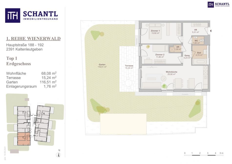 Wohnfläche: ca. 68,08m² + Terrasse: ca. 15,24m² + Garten: ca. 116,51m² + Kellerabteil: ca. 1,76m²