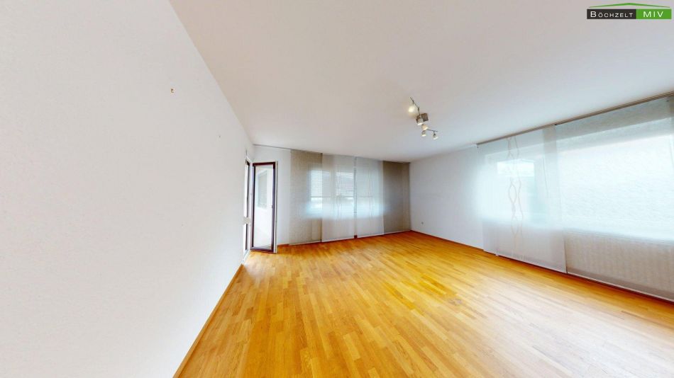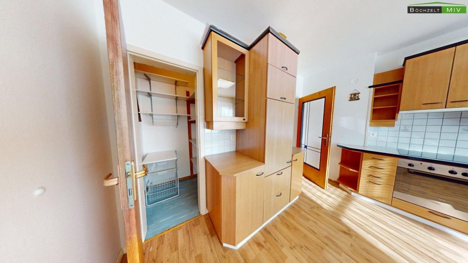 Die zweite Wohneinheit im Obergeschoss ist über das gemeinsame Stiegenhaus separat zugänglich und weist einen nahezu identen Grundriss mit einer Wohnfläche von rund 99,3 m² auf. Nach dem Eintreten erreicht man einen hellen Flur mit Platz für Garderobe und Stauraum. Das sehr große Wohnzimmer mit etwa 26,9 m² ist mit Parkettboden ausgestattet, verfügt über mehrere Fenster und einen direkten Ausgang auf den Balkon. Dieser bietet einen schönen Blick in den Garten- und Siedlungsbereich. Die Küche mit etwa 14 m² ist mit einer gepflegten Einbauküche versehen und verfügt ebenfalls über eine angrenzende Speis, wodurch sich der Raum sehr gut als Wohnküche nutzen lässt. Zwei weitere Zimmer stehen als Schlafzimmer, Kinder- oder Arbeitszimmer zur Verfügung. Das Badezimmer bietet sowohl eine Badewanne als auch eine separate Dusche, ein Waschbecken sowie ein Fenster und präsentiert sich vollständig verfliest und technisch in gutem Zustand. Ein separates WC mit Fenster komplettiert die Sanitärausstattung dieser Einheit. Die Oberflächen und Bodenbeläge sind teilweise älteren Datums, jedoch gepflegt, sodass je nach Anspruch eine optische Erneuerung sinnvoll sein kann.