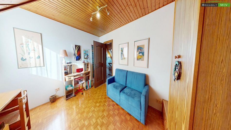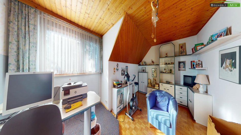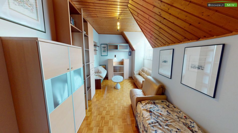 Das Dachgeschoss präsentiert sich als perfektes Reich für Kinder, Gäste oder als eigenständige Wohneinheit. Ein heller Flur führt zu drei überdurchschnittlich großen (Schlaf-/Kinder-)Zimmern (ca. 18 bis 21 m²). Ein eigenes, fast 10 m² großes Badezimmer sowie ein separates WC auf dieser Ebene verhindern den morgendlichen Stau im Bad und unterstreichen das Potenzial zur Nutzung als Zweifamilienhaus.