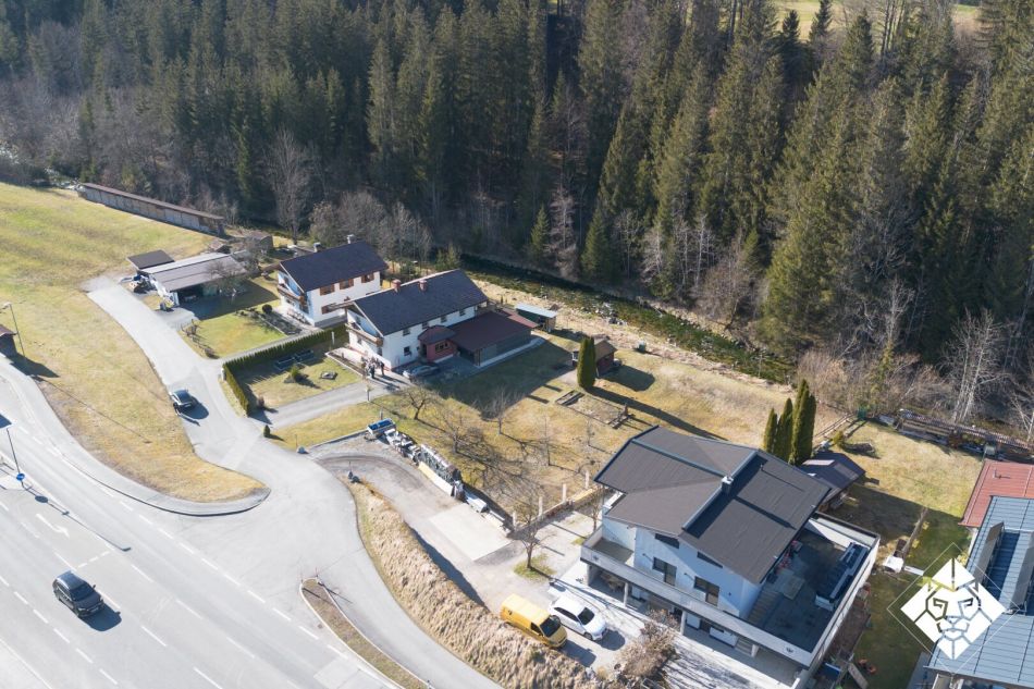 Das Grundstück befindet sich in sonniger Lage zwischen Walchsee und Kössen, eingebettet in eine beeindruckende Naturlandschaft mit direktem Blick auf den Zahmer Kaiser. Die umliegende Bergkulisse verleiht dem Standort eine besondere Ruhe und Wohnqualität. Rückseitig wird das Grundstück von einem idyllischen Bachlauf begrenzt, der das naturnahe Gesamtbild zusätzlich unterstreicht.