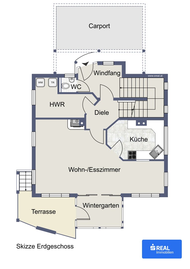 Ein Carport ergänzt das Gesamtbild und fügt sich harmonisch in das Ensemble ein, sodass auch praktische Aspekte des Alltags elegant gelöst sind.