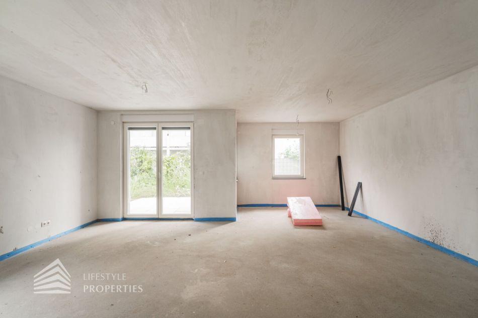 Beim Betreten des Hauses werden Sie in einen großzügigen Eingangsbereich geführt, der den Weg zum Herzstück des Hauses, dem Wohn- und Essbereich, eröffnet. Dieser Bereich bietet ausreichend Platz für Ihre individuellen Einrichtungsideen und wird gänzlich mit Licht durchflutet. Große Fenster eröffnen den Blick auf den eigenen ca. 80 m² großen Garten und schaffen eine harmonische Verbindung zwischen drinnen und draußen. Die angrenzende Terrasse mit ca. 9 m² verlockt dazu, die frische Luft zu genießen, Freunde und Familie zu empfangen oder einfach nur zu entspannen. Auf dieser Ebene finden Sie auch ein äußerst praktisches Gäste-WC, dass den Komfort für Ihre Besucher erhöht, sowie einen zusätzlichen Abstellraum, der Platz für Vorräte und Haushaltsgegenstände bietet.