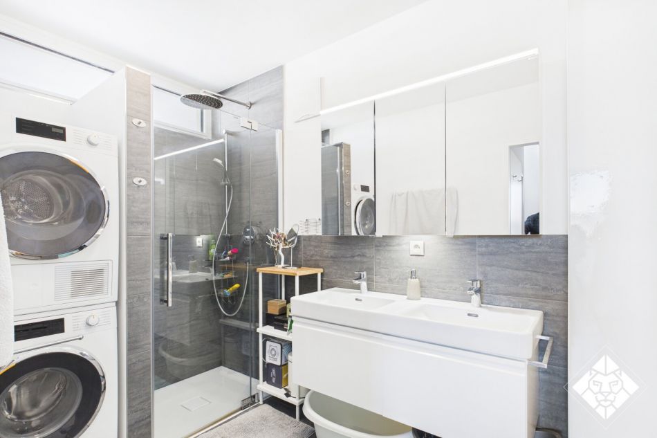 Tageslichtbad mit großer Dusche und Doppelwaschbecken