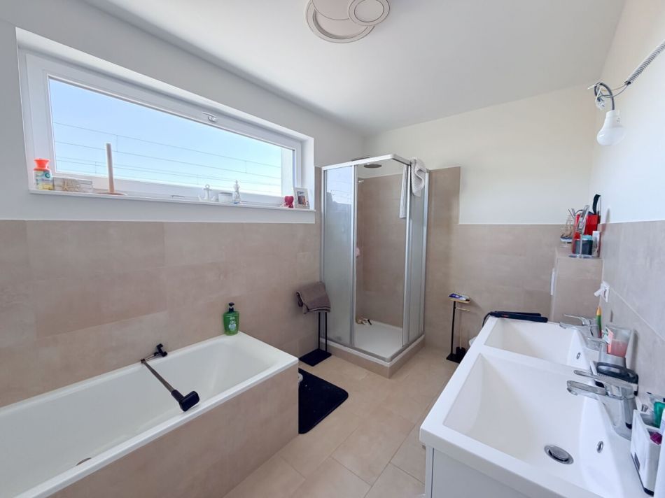 - ein geräumiges Badezimmer mit Dusche und Badewanne