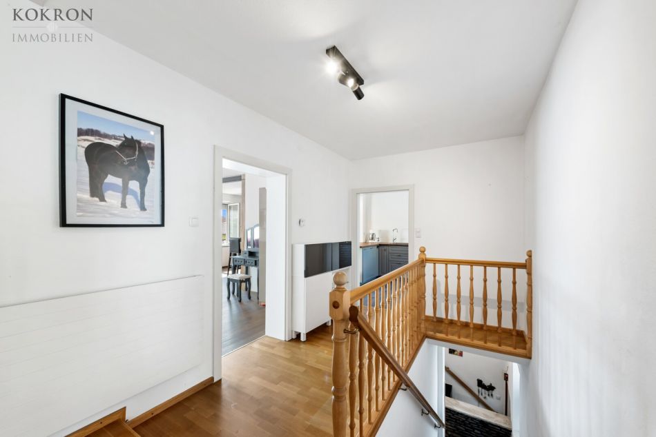 Über die zentrale und gradläufige Holzstiege gelangen Sie in das Obergeschoss.