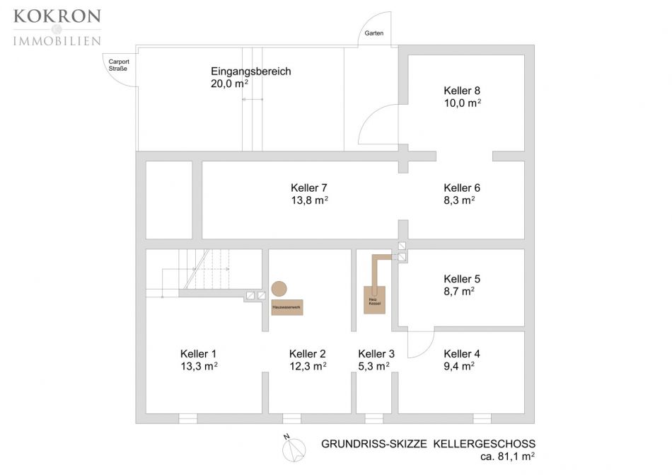 Ein ca. 80 m² großer Keller bietet mit einzelnen Räumlichkeiten viel Stauraum für Ihr Hab und Gut.