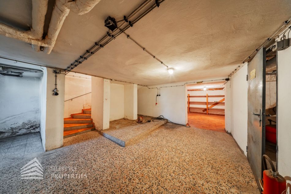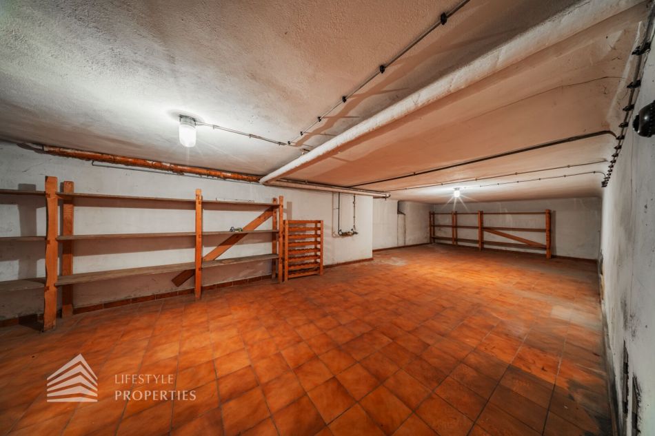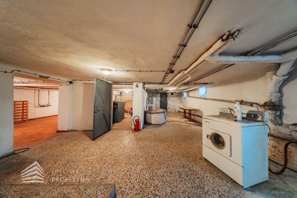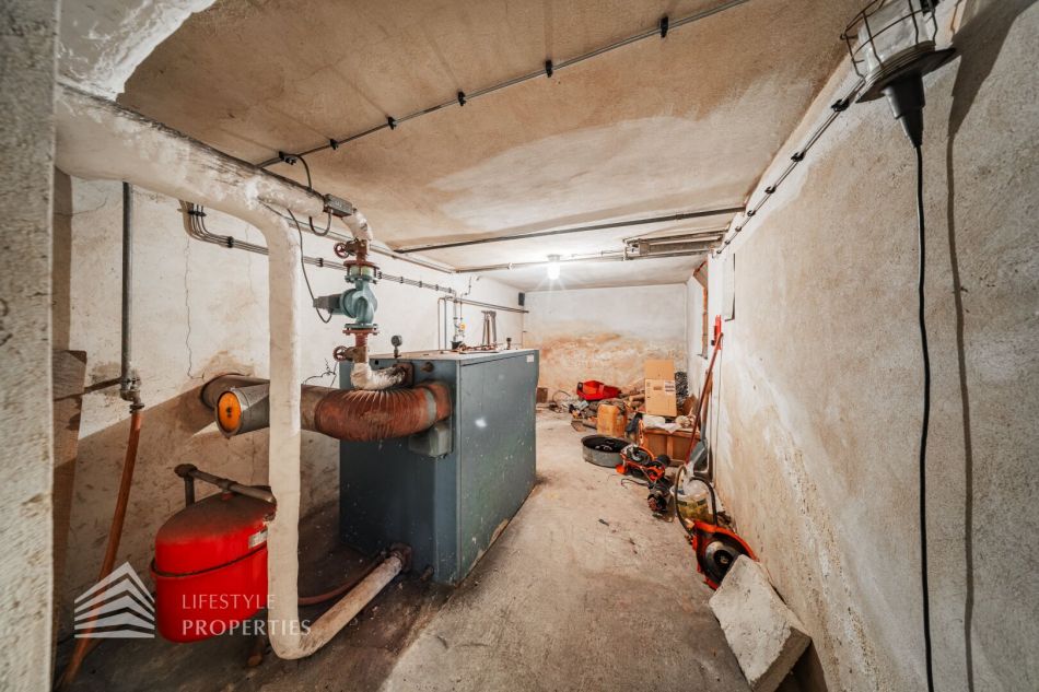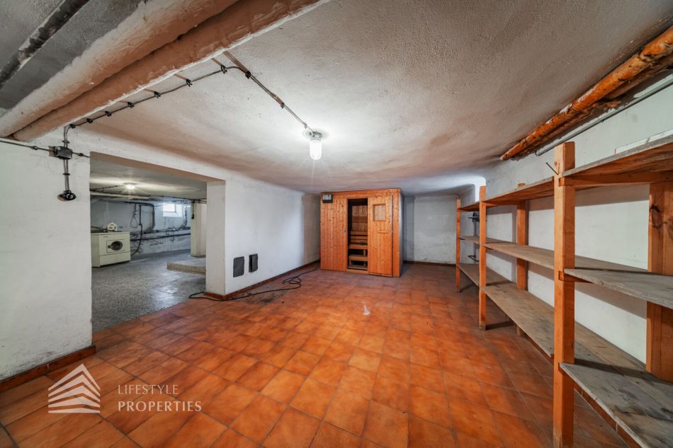 Im Keller, welcher eine Fläche von ca. 185 m² aufweist, befinden sich ein großzügiger Vorraum mit Stiegenabgang, Heizraum, Tankraum sowie diverse Kellerräume wie Lager- und Fitnessräume.
