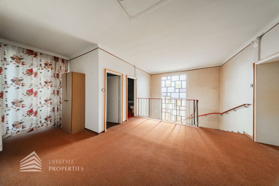 Das Obergeschoss mit einer Fläche von ca. 185 m² teilt sich in einen großen Vorraum, Dusche/WC sowie fünf geräumige Zimmer, zwei davon mit Balkonzugang (Balkon ca. 12 m²), auf.