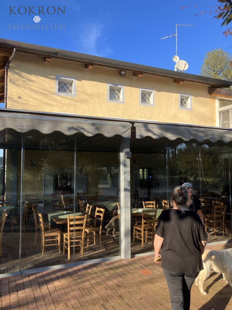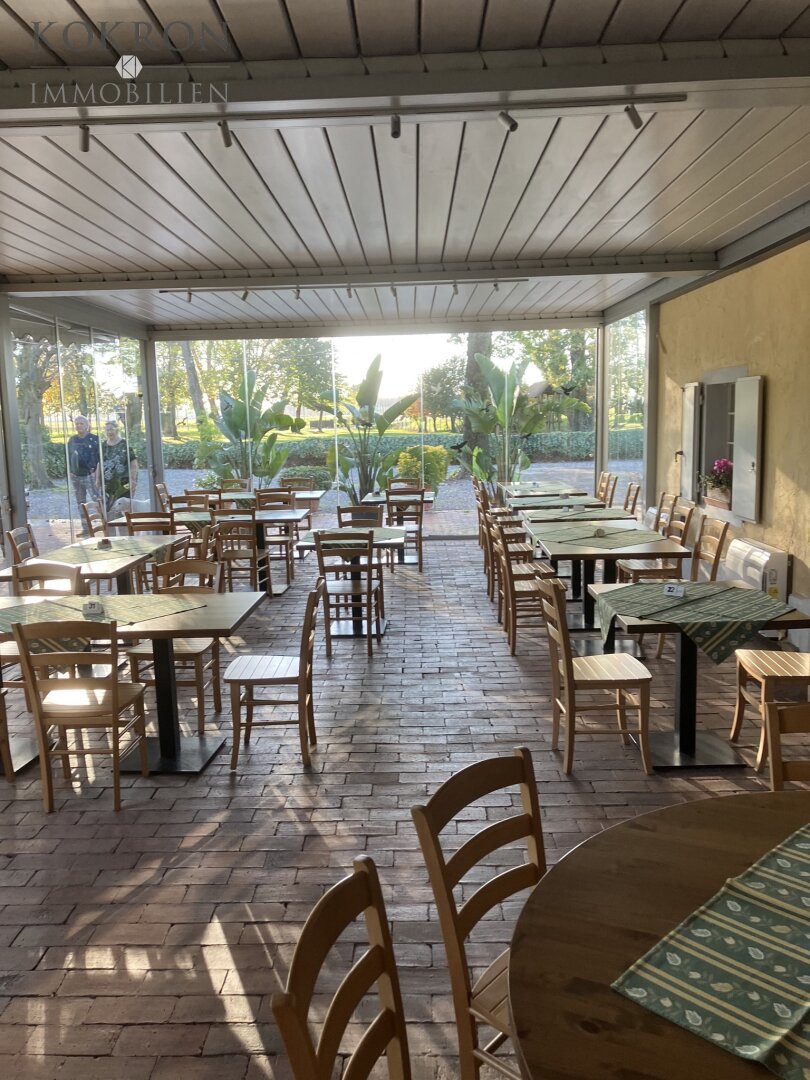 Biodynamische Glasveranda, klimatisiert, Gasträume mit Holztramen. Die Böden Holzparkett bzw. historische Ziegel. Insges. Ca. 200 qm Gastrofläche indoor für ca. 200 Gäste.