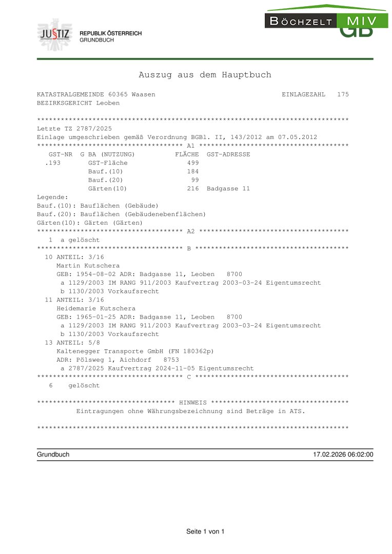 Rechtlich handelt es sich bei der Liegenschaft nicht um Wohnungseigentum, sondern um schlichtes Miteigentum mit Benützungsregelung. Für das Objekt besteht eine Mehrheitseigentumsposition von 5/8 an der Gesamtliegenschaft.