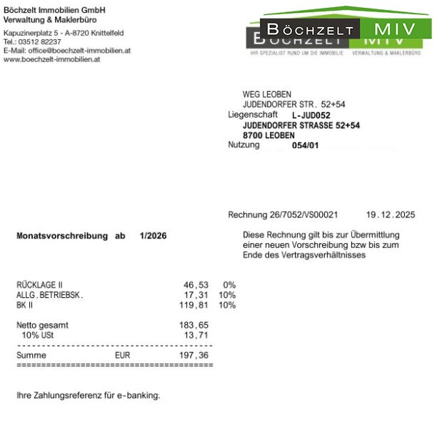 Die monatlichen Kosten betragen aktuell ca. 197,36 € brutto (inkl. Betriebskosten von ca. 137,12 € und einem Beitrag zur Reparaturrücklage von ca. 46,53 €). Bitte beachten Sie, dass die Heiz- und Stromkosten separat abzurechnen sind. Die Reparaturrücklage für die Liegenschaft beträgt per Februar 2026 ca. 38.170,84 €. Derzeit ist die Errichtung einer Enthärtungsanlage (Kalk) sowie eines außenliegenden Müllraumes geplant, wobei die Kosten dafür entweder aus der Rücklage oder alternativ aus der Veräußerung des unnutzbaren Uferstreifens für die geplante Errichtung des Murkraftwerks Leoben-Ost an die Energie Steiermark gedeckt wären.