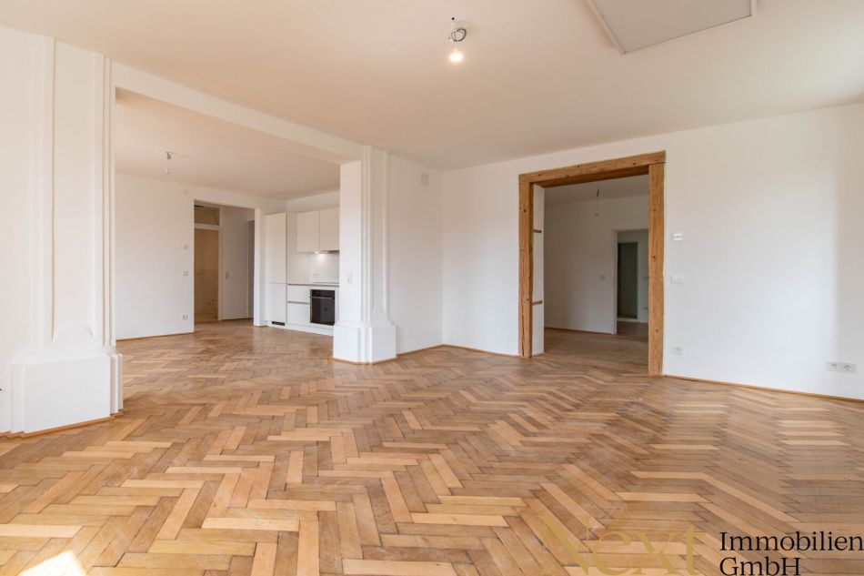 Die Wohnung beeindruckt mit ihren wunderschönen Säulenelementen, edlen Holzböden & -details und einer durchdachten Raumaufteilung auf ca. 104m².