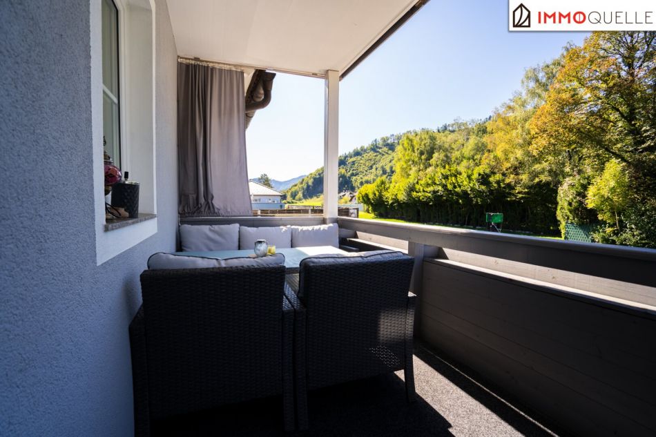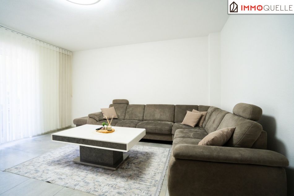 Geradeaus öffnet sich das große Wohnzimmer, das mit seiner einladenden Fensterfront und dem Zugang zum 9,5 m² großen Balkon der zentrale Lebensraum der Wohnung ist. Von hier genießen Sie die Aussicht auf die grüne Umgebung und die sanfte Bergkulisse – besonders abends, wenn die Sonne tief steht, entsteht hier eine ganz besondere Atmosphäre.