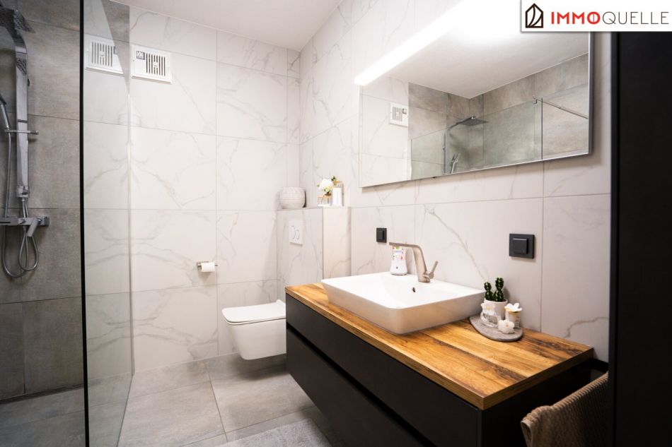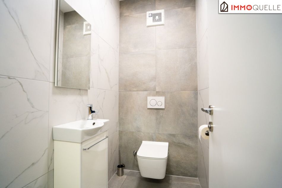 Über das gemeinsame Stiegenhaus erreichen Sie die Wohnung bequem zu Fuß. Schon beim Eintreten wird klar: Hier erwartet Sie ein harmonischer Grundriss mit klaren Linien und viel Tageslicht. Rechter Hand befinden sich ein praktischer Abstellraum, das separate Gäste-WC sowie das hochwertig ausgestattete Badezimmer mit Dusche und WC – hell gefliest und modern gestaltet.