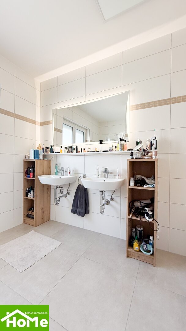 Badezimmer mit Wanne, Runddusche und Doppelwaschbecken