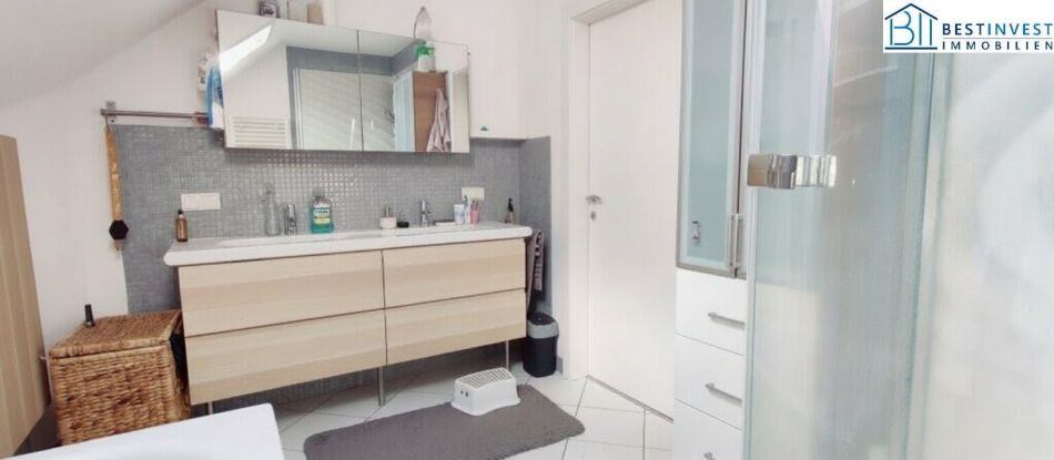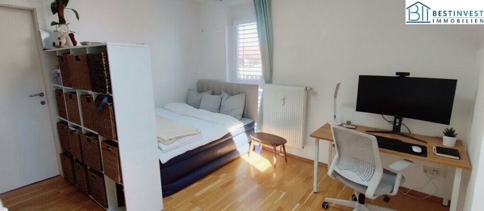 2 Schlafzimmer und einem Gäste-Bürobereich, Badezimmer, Abstellraum und einen ca. 20m² großen Dachboden zum lagern.