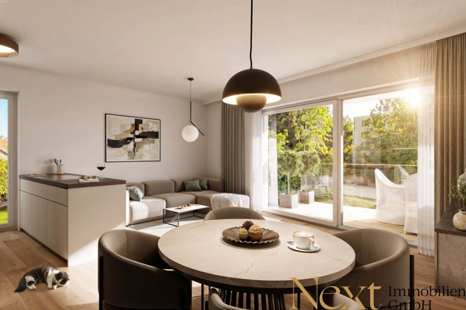 Der lichtdurchflutete Wohn-, Ess- und Kochbereich sowie das Schlafzimmer führen direkt zur ca. 6,30m² großen Loggia bzw. 3,70m² großen Terrasse mit Zugang zum herrlichen ca. 71m² großen Privatgarten.