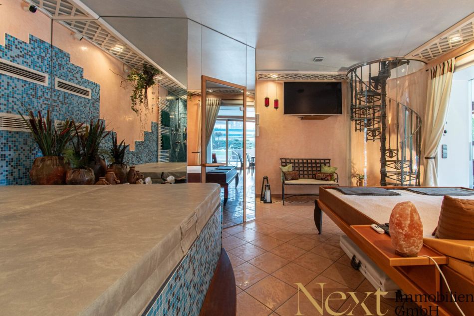 Wellnessbereich mit Sauna, Dusche und Wasserbett