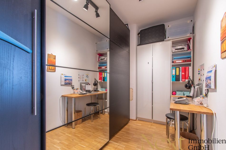 Das Schlafzimmer ist über einen separaten Schrankraum begehbar, der zusätzlichen Stauraum bietet und den Schlafbereich vom Wohnraum trennt.