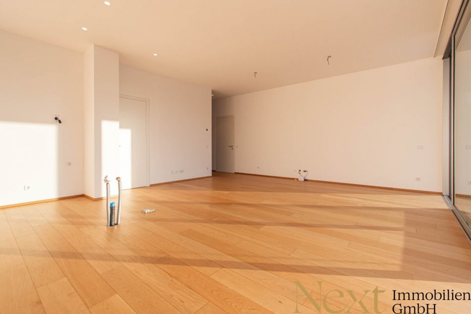 Die diversen Räumlichkeiten dieser Wohnung werden nahezu malerisch in Szene gesetzt - bodentiefe Glasfronten sorgen für eine entspannte und angenehme Wohnatmosphäre. In den Nassbereichen kommen zeitlose Feinsteinzeug-Fliesen zum Einsatz, während in den Wohn- und Schlafräumen ein edler Eichen-Echtholzparkettboden verlegt ist. Die dreifach verglasten Schallschutzfenster werden darüber hinaus mit elektrisch gesteuerten Raffstores versehen.