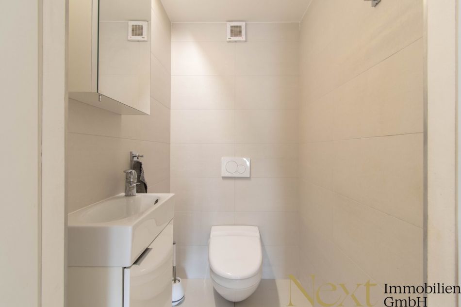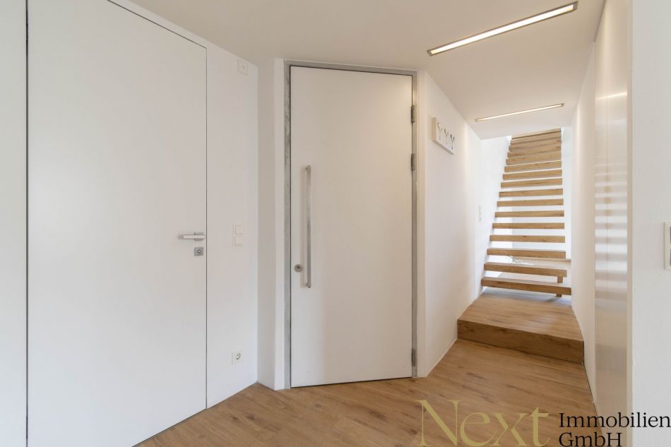 Die hochwertige Einbauküche ist durch eine Schiebetür optisch vom Wohnbereich abgetrennt. Im Erdgeschoß befindet sich außerdem noch ein modernes Badezimmer mit Badewanne und begehbarer Regendusche, eine separate Toilette sowie ein vielseitig nutzbarer Raum. Des weiteren verfügt die Wohnung über eine Bibliothek, welche auch als weiteres Schlafzimmer oder Büro genutzt werden kann.