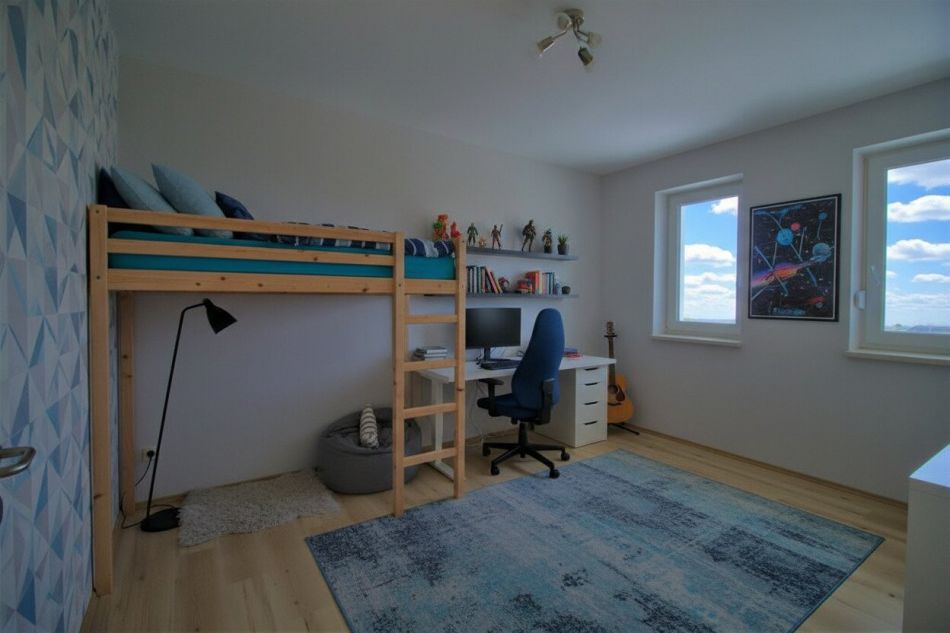 Das Erdgeschoss ist offen gestaltet - offener Küchen-, Ess- und Wohnbereich. Der Technikraum befindet sich im Erdgeschoss beim Eingangsbereich. Drei weitere Zimmer befinden sich im Obergeschoss, wo sich auch das Badezimmer mit Fenster und ein extra WC (auch mit Fenster), befinden.
