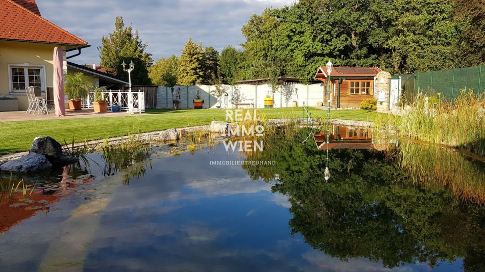 Für eine nasse Abkühlung im Hochsommer sorgt ein Schwimmteich mit Steg, Felsen mit Wasserfall, Oase-Filter mit UVC-Vorklärgerät und eine Freiluftdusche mit Solarheizungsbetrieb.