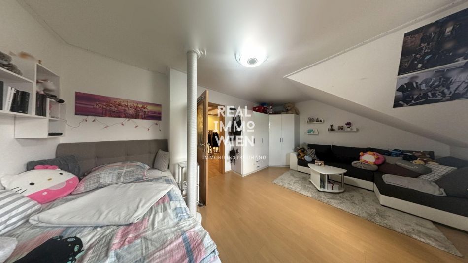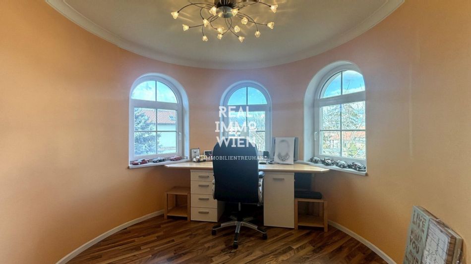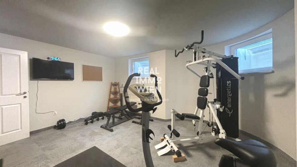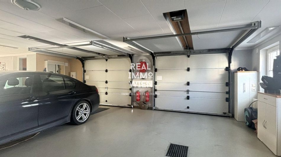 Ein geräumiger Vorplatz ermöglicht die Einfahrt auf zwei Garagenplätze. In das Haus gelangt man über einen Vorraum. Danach öffnet sich das große, sonnendurchflutete Wohnzimmer mit einer offenen Küche. In der tischlerangefertigten Küche mit Blick in den Garten findet man sämtliche Marken-Küchengeräte. Das helle Wohnzimmer besticht durch Glasfronten, die mit außenliegenden Sonnenschutz mit Lichtsensor und Windrad ausgestattet sind. Weiters befinden sich im Erdgeschoß ein Schlafzimmer, ein Badezimmer mit Wanne und Waschmaschinenanschluss sowie ein Gäste-WC. Im Obergeschoß befinden sich zwei weitere Schlafzimmer, ein Arbeitsraum, ein Abstellraum als auch ein Bad mit Dusche und Waschmaschinenanschluss, alle Räume sind zentral begehbar. Im Keller finden Sie einen großen Party-Raum, von dem aus ein weiteres Schlafzimmer, ein Fitnessraum, ein Abstellraum und insgesamt drei Technik- bzw. Werkstättenräume zu erreichen sind.