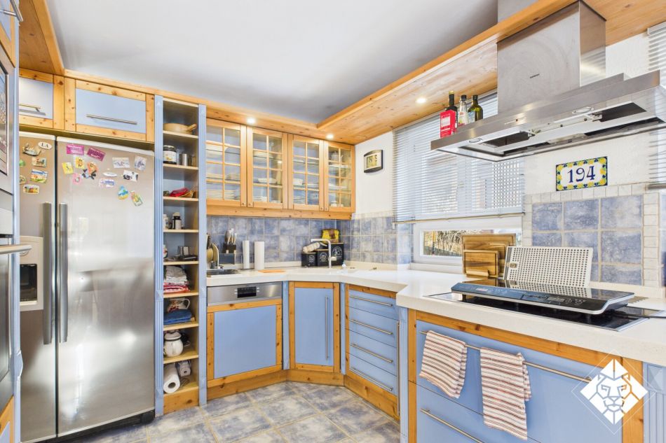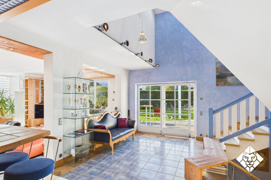 Das Haus vereint traditionelle Architektur mit einem durchdachten, großzügigen Raumkonzept. Der Wohnbereich ist auf Offenheit und Geselligkeit ausgerichtet: warme Holzoberflächen, ein zentral positionierter Barbereich und große Fensterfronten schaffen eine helle, einladende Atmosphäre.