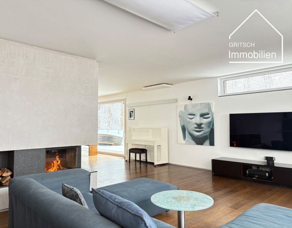 Das Herzstück des Hauses bildet der offen gestaltete Wohn- und Essbereich im Obergeschoss mit großen Fensterelementen, moderner Einbauküche sowie einem stilvollen Designofen. Von hier aus gelangt man direkt auf die großzügige Terrasse mit beeindruckender Aussicht und hoher Privatsphäre.