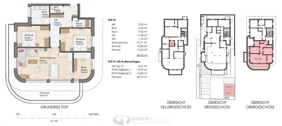 Aufteilung: Wohnung TOP 1 mit 92,33m² und 28,76m² Terrasse