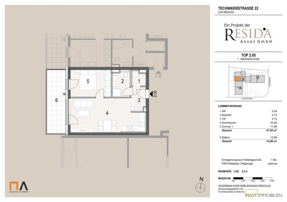 Die Wohnung befindet sich im 1. OG und verfügt über 47,95 m² Wohnfläche + einen 12,86 m² großen Balkon.