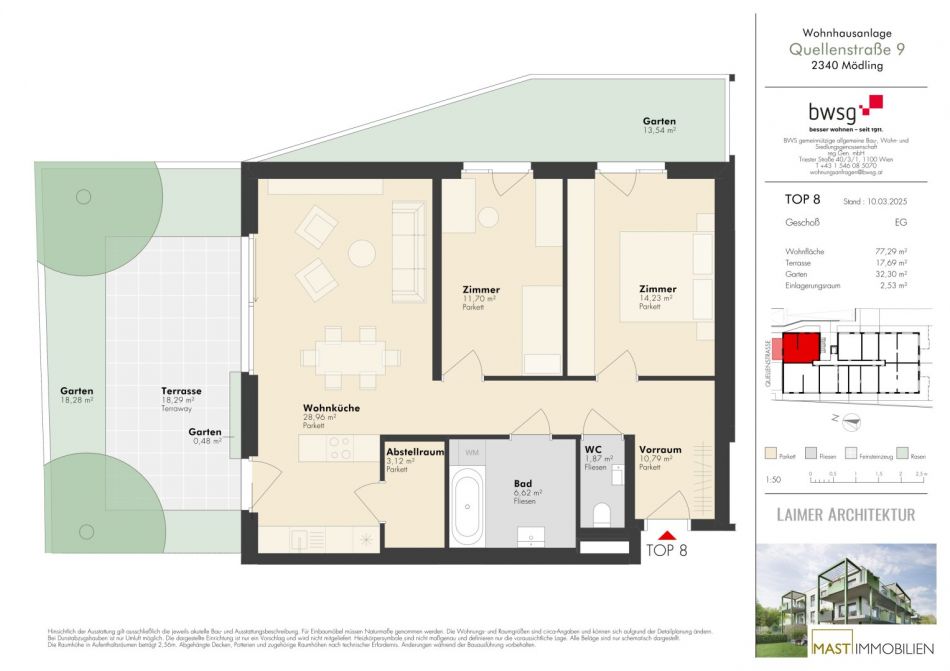 Die Wohnung befindet sich im Erdgeschoss und verfügt über 77,29 m² Wohnfläche + eine 17,69 m² große Terrasse und einen 32,30 m² großen Garten.