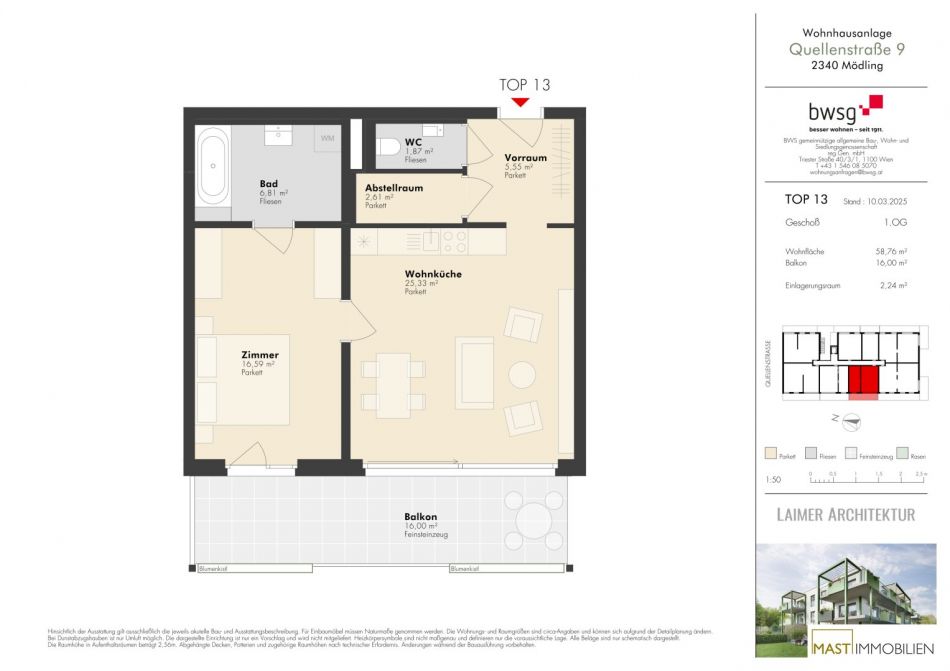 Die Wohnung befindet sich im 1. Obergeschoss und verfügt über 58,76 m² Wohnfläche + einen 16,00 m² großen Balkon.
