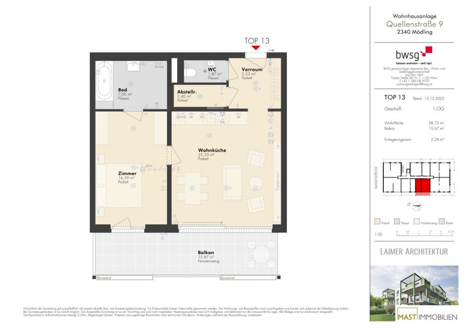Die Wohnung befindet sich im 1. Obergeschoss und verfügt über 58,76 m² Wohnfläche + einen 15,67 m² großen Balkon.