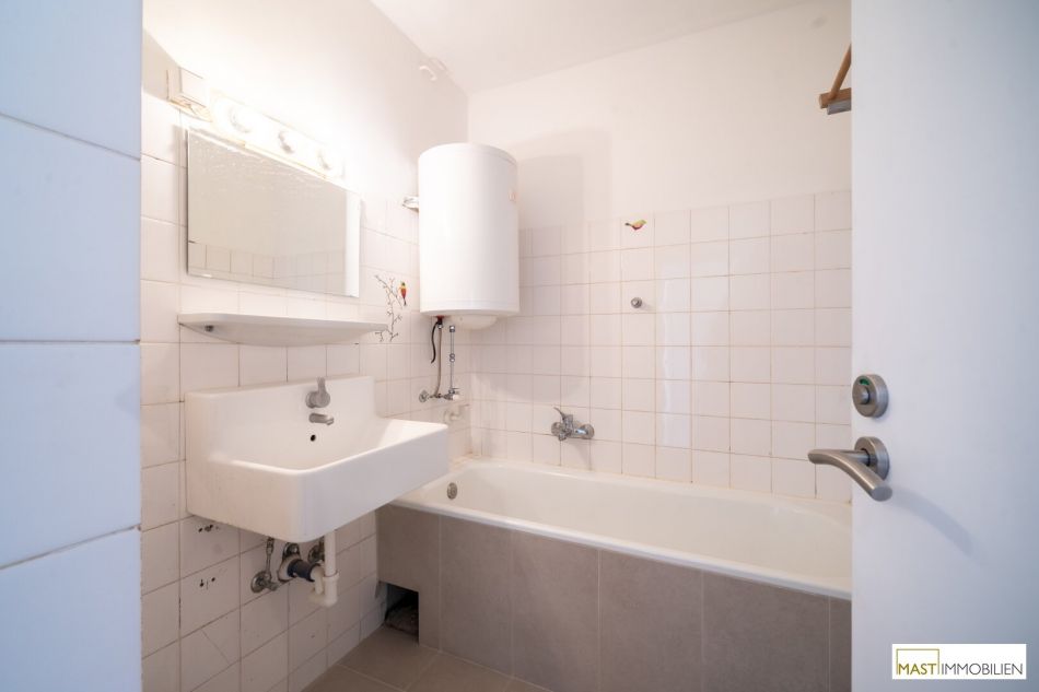 Das Badezimmer ist voll funktionsfähig und muss grundsätzlich nicht saniert werden. Besonders hervorzuheben ist der neu verlegte Parkettboden, der sich durch die gesamte Wohnung zieht und für eine hochwertige Wohnatmosphäre sorgt.