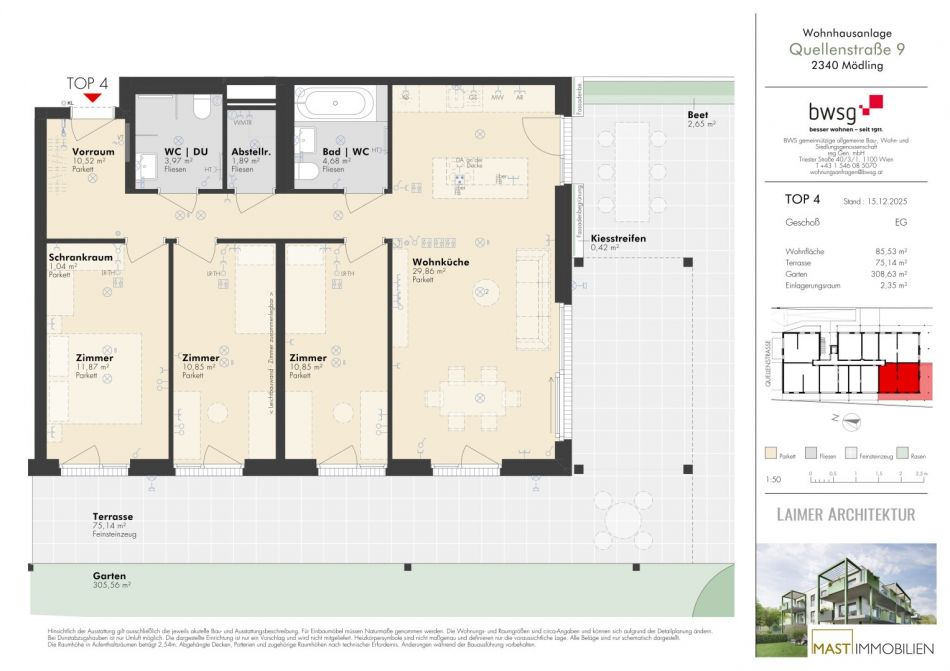 Die Wohnung befindet sich im Erdgeschoss und verfügt über 85,53 m² Wohnfläche + eine 75,14 m² große Terrasse und einen 308,63 m² großen Garten.