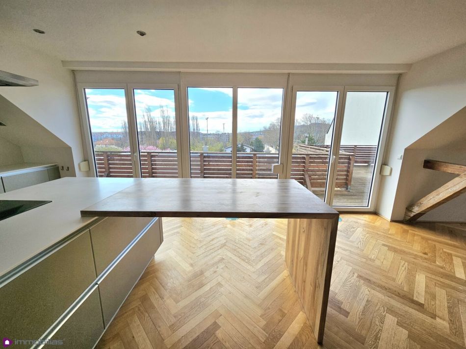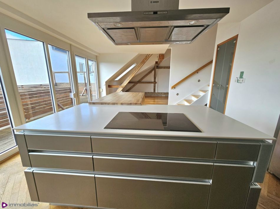 lichtdurchflutete Wohnküche, ca 22,82 m², mit Ausgang auf die traumhafte, innenhofseitige Terrasse mit Fernblick über die Dächer der Stadt, ca 37,33 m²