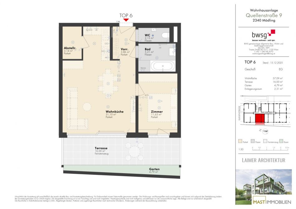 Die Wohnung befindet sich im Erdgeschoss und verfügt über 57,09 m² Wohnfläche + eine 16,00 m² große Terrasse und einen 4,79 m² großen Garten.