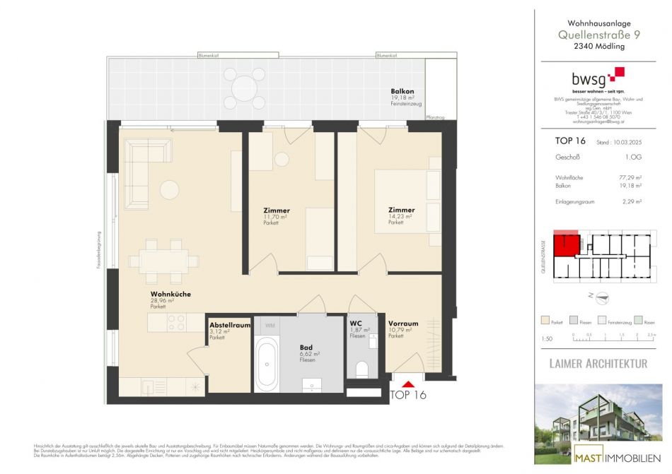Die Wohnung befindet sich im 1. Obergeschoss und verfügt über 77,29 m² Wohnfläche + einen 19,18 m² großen Balkon.