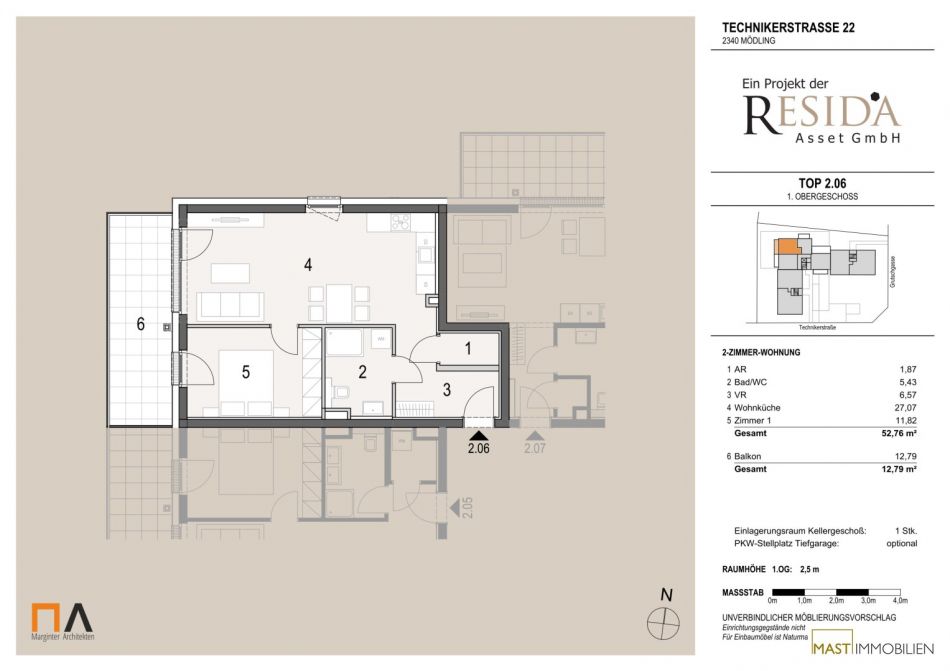 Die Wohnung befindet sich im 1. Obergeschoss und verfügt über 52,76 m² Wohnfläche + einen 12,79 m² großen Balkon.