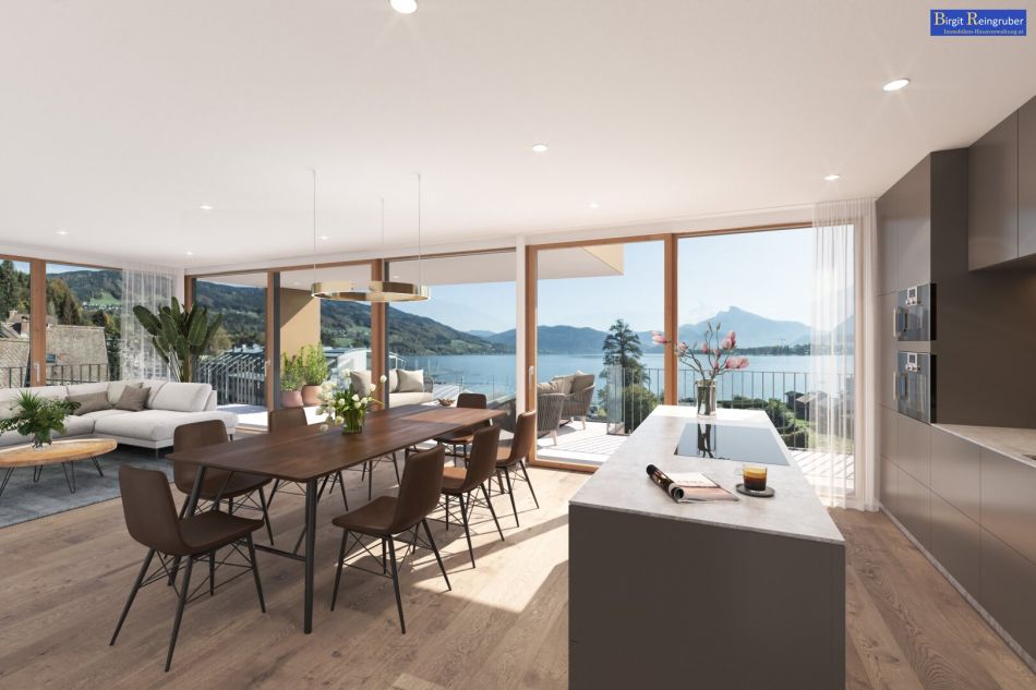 Mit einer großzügigen Wohnfläche von 93,36 m² bietet diese lichtdurchflutete Wohnung genügend Raum für individuelles Wohnen. Sie betreten die Wohnung und werden sofort von einem offenen Wohn- und Essbereich empfangen, der durch große Fensterflächen viel Tageslicht und einen unvergleichlichen Blick auf den Mondsee und die umliegenden Berge bietet. Hier können Sie entspannte Stunden mit Familie und Freunden verbringen oder einfach die Ruhe und Schönheit der Natur genießen.