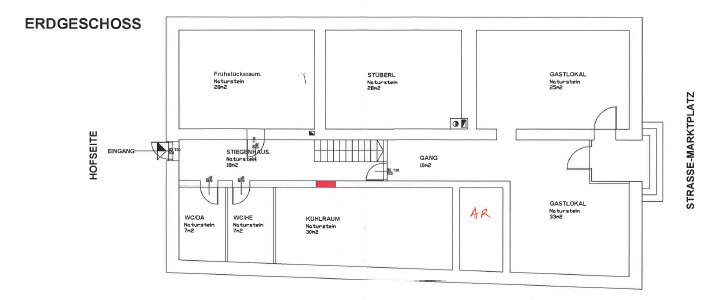 Gewerbefläche von ca. 120m² - WC-Anlagen für Damen und Herren jeweils ca. 7m² - eine Freifläche (Gastgarten)